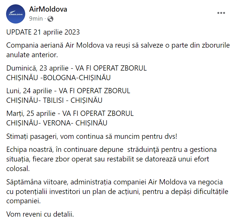 Денег нет: компания Air Moldova отменила все рейсы до 25 апреля