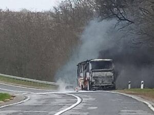 (ФОТО) Недалеко от Страшен загорелся автобус, который вез людей на протест: в нем было 49 пассажиров 12 января, 2024