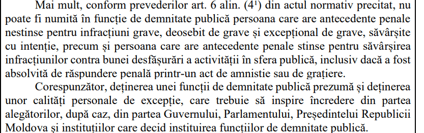 «Занятие государственной должности предполагает наличие исключительных личных качеств, которые должны внушать доверие со стороны избирателей, либо со стороны правительства, парламента, президента Республики Молдова и учреждений, которые учреждают такие должности», — утверждают авторы инициативы.