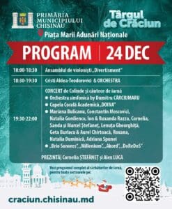 Мэрия Кишинёва приглашает жителей и гостей столицы на Рождественский концерт, который пройдёт 24 декабря, начиная с 18:00, в рамках Рождественской ярмарки на Площади Великого Национального Собрания.