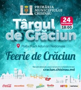 Мэрия Кишинёва приглашает жителей и гостей столицы на Рождественский концерт, который пройдёт 24 декабря, начиная с 18:00, в рамках Рождественской ярмарки на Площади Великого Национального Собрания.