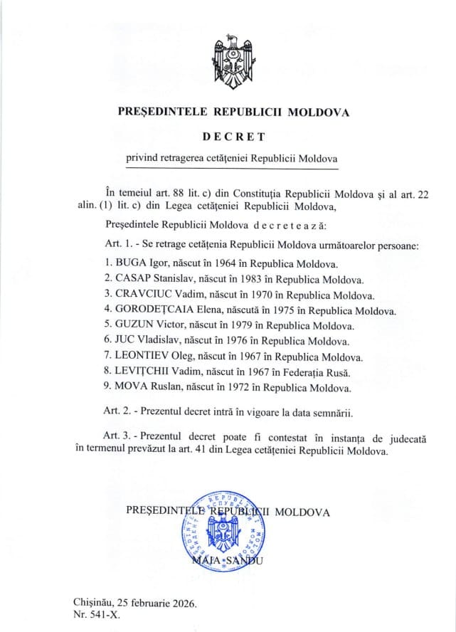 В список лиц, утративших гражданство, вошли Игорь Буга, Станислав Касап, Вадим Кравчук, Елена Городецкая, Виктор Гузун, Владислав Жук, Олег Леонтьев, Вадим Левицкий и Руслан Мова. Указ вступил в силу с момента подписания, 25 февраля 2026 года.
