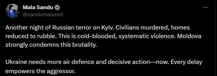 «Еще одна ночь российского террора по Киеву. Убиты мирные жители, дома превращены в руины. Это хладнокровное, систематическое насилие. Молдова решительно осуждает эту жестокость», — написала глава государства в социальной сети X.