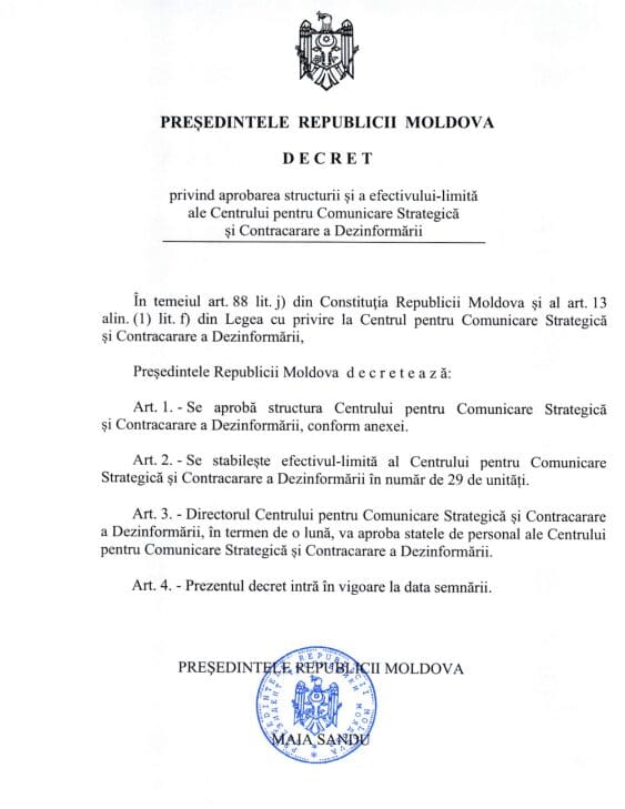 Вчера, во вторник 16 сентября, глава государства Майя Санду подписала указ, которым утверждается структура и штат Центра стратегической коммуникации и противодействия дезинформации (STRATCOM). Документ вступил в силу сразу после подписания.