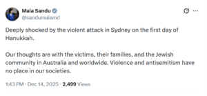 «Мы выражаем соболезнования жертвам, их семьям и еврейской общине Австралии и всего мира. Насилию и антисемитизму нет места в наших обществах», — отметила глава государства Майя Санду в соцсети X.