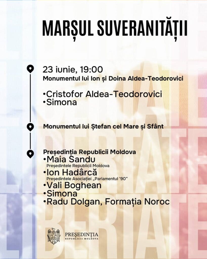 В понедельник, 23 июня, по случаю 35-летия принятия Декларации о суверенитете в Кишиневе состоится Марш суверенитета, организованный по инициативе президента Майи Санду. По словам организаторов, это событие представляет собой момент празднования первой крупной победы в борьбе за возрождение и национальное освобождение.
