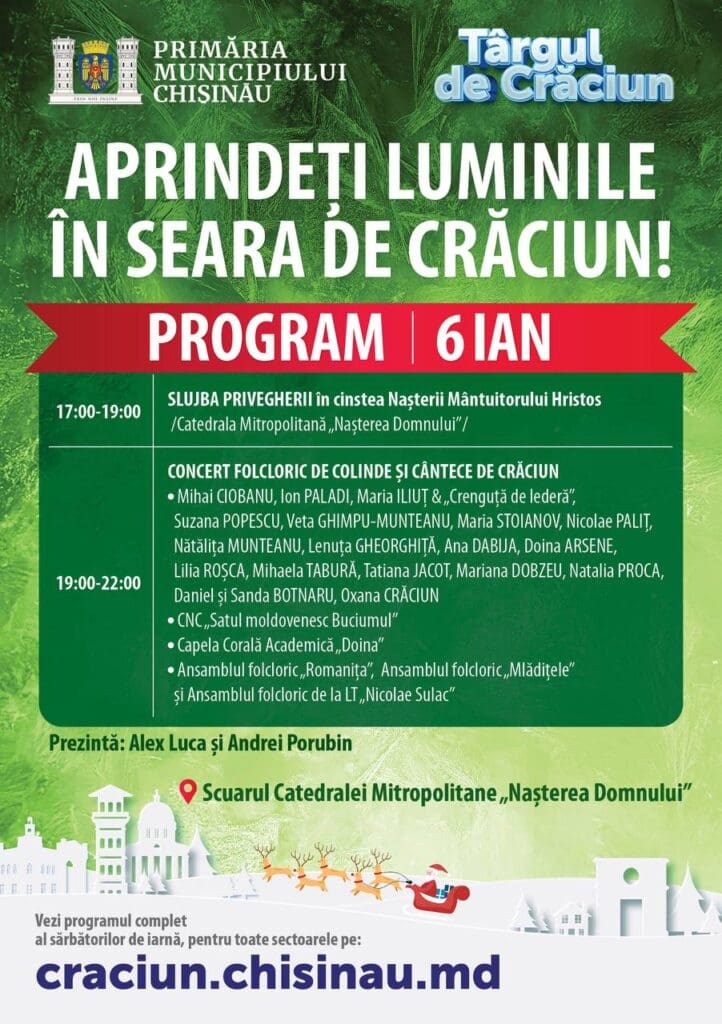 Мэрия муниципия Кишинев организует 6 января, в канун Рождества, праздничное мероприятие в рамках Рождественской ярмарки. Мероприятие названо «Зажгите огни в рождественский вечер» и является частью программы зимних праздников, организованных муниципалитетом.