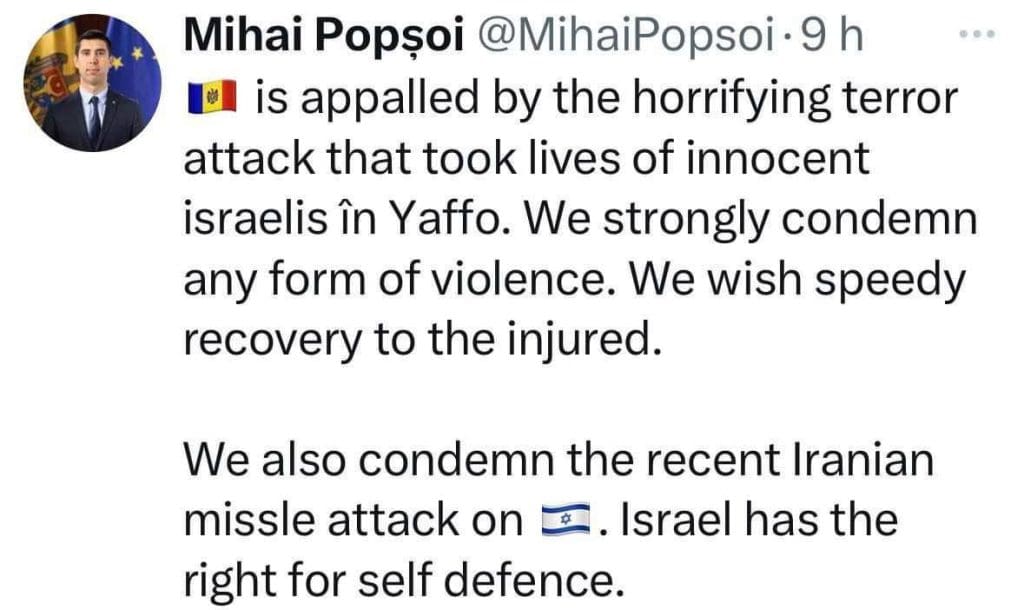 «Мы потрясены ужасным терактом, который унес жизни невинных израильтян в Яффо. Решительно осуждаем любую форму насилия и желаем скорейшего выздоровления пострадавшим. Также осуждаем недавний ракетный удар Ирана по Израилю. У Израиля есть право на самооборону», — написал чиновник в X.
