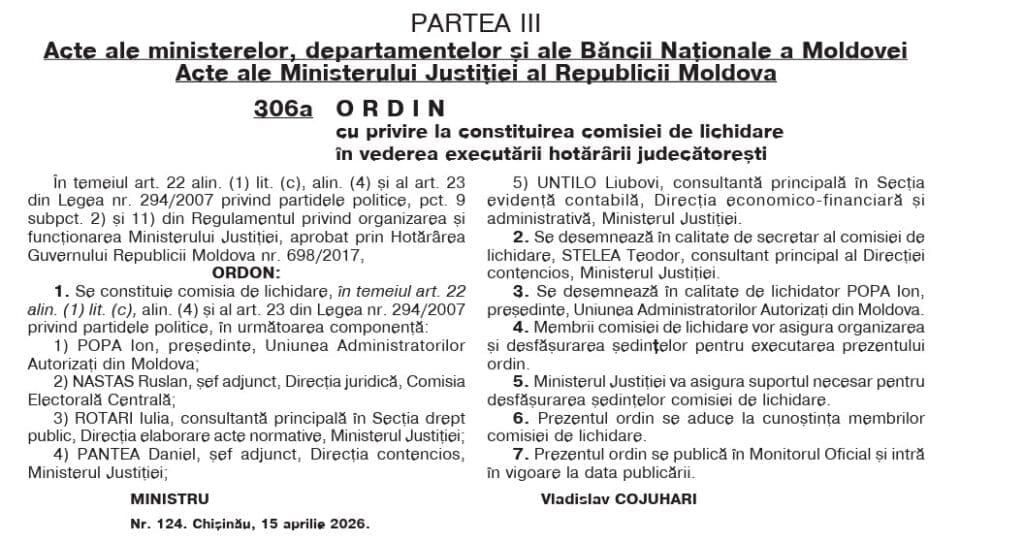 Согласно тексту приказа, комиссия наделена полномочиями по организации и координации процедур ликвидации. В ее состав вошли представители министерства юстиции, Центральной избирательной комиссии (ЦИК) и Союза авторизованных управляющих Молдовы.