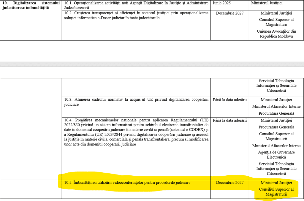 Власти утверждают намерены продолжить процесс обновления цифровой инфраструктуры. Ведомство уточняет, что в проекте государственного бюджета на 2026 год предусмотрено выделение 5,5 миллиона леев на расширение использования видеоконференцсвязи. Полная модернизация и внедрение новых стандартов запланированы в рамках дорожной карты «Верховенство закона», где срок реализации установлен до декабря 2027 года.