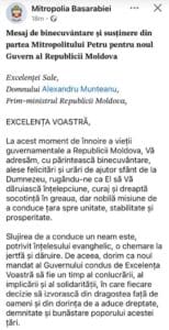 Митрополия Бессарабии направила послание с благословением и поддержкой в адрес нового правительства Республики Молдова, возглавляемого премьер-министром Александру Мунтяну. В письме, подписанном митрополитом Петру, выражается уверенность в том, что правительственная команда будет руководить страной с мудростью, мужеством и справедливостью, способствуя единству, стабильности и процветанию.