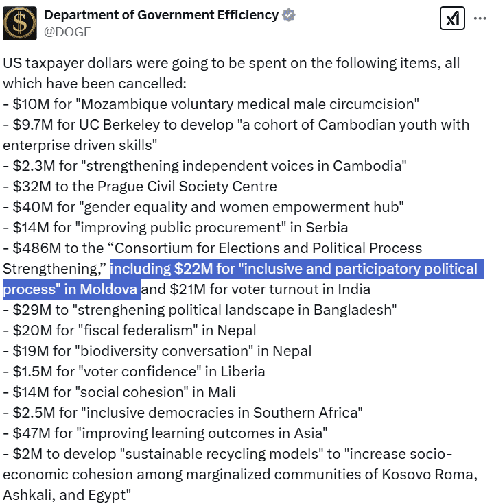 Республика Молдова теряет финансовую поддержку в размере 22 миллионов долларов после того, как Департамент правительственной эффективности (DOGE) США, возглавляемый Илоном Маском, объявил об отмене фонда в $486 млн, предназначенного для «Консорциума по выборам и укреплению политического процесса».