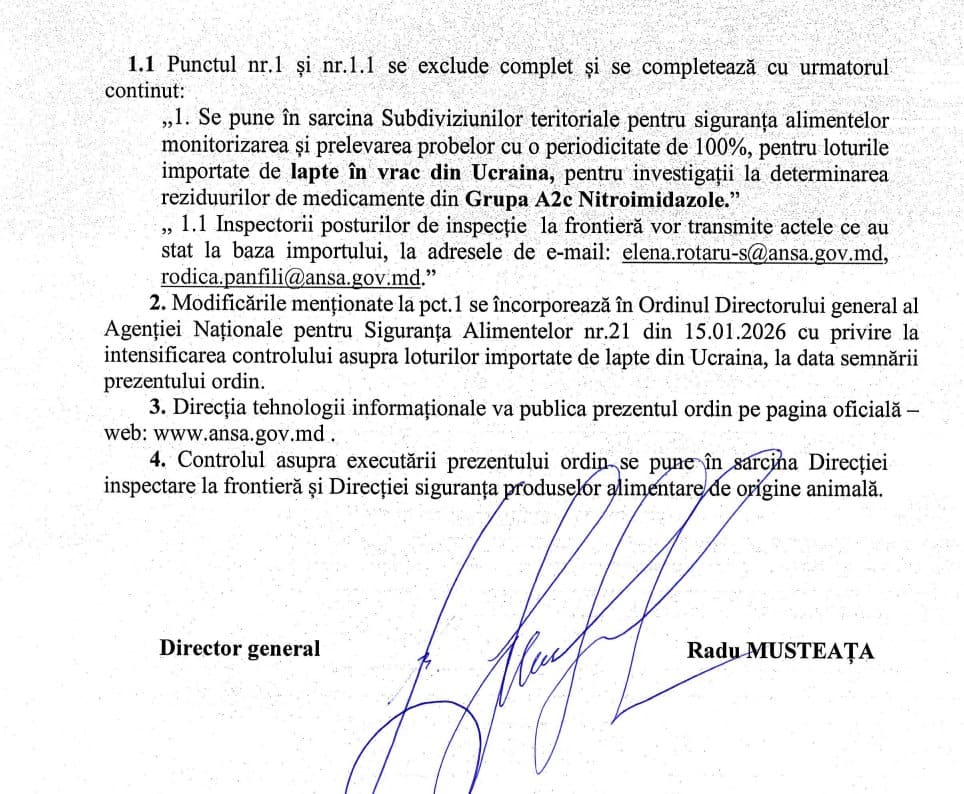 В документе отмечается, что мера принимается «в целях обеспечения потребителя безопасными для потребления пищевыми продуктами». Приказ подписан генеральным директором НАБПП Раду Мустяцэ.