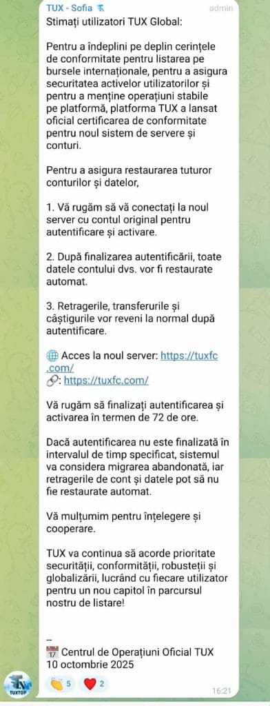 Вечером 9 октября пользователи стали получать сообщение с обещанием восстановить их аккаунты и средства, но только после входа на новый сервер и оплаты запрошенной суммы. В сообщении администраторы TUX ссылаются на: «сертификацию соответствия для листинга на международных биржах» и «безопасность активов пользователей».