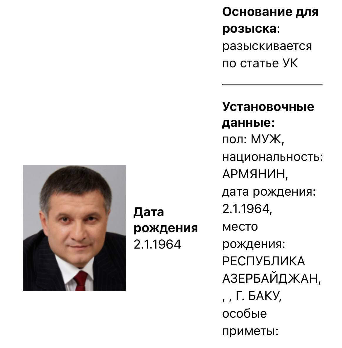 «Арсен Борисович Аваков, 2.1.1964. Основания для розыска: разыскивается по статье УК», — сказано в базе розыска МВД. По какой именно статье разыскивают Авакова, не уточняется.