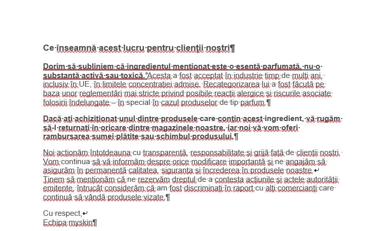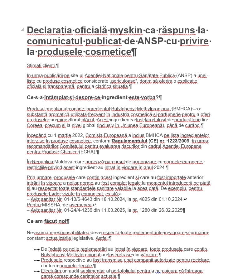 Магазин MySkin прокомментировал решение Национального агентства общественного здоровья Молдовы (НАОЗ/ANSP) об изъятии с рынка косметики, содержащей ингредиент Butylphenyl Methylpropional (BMHCA). В официальном заявлении компания подчеркнула, что данный компонент долгое время использовался в косметической и парфюмерной промышленности, в том числе в Корее и странах Европейского союза. Запрет на его использование в Молдове вступил в силу только в 2024 году в рамках гармонизации национального законодательства с европейскими нормами.