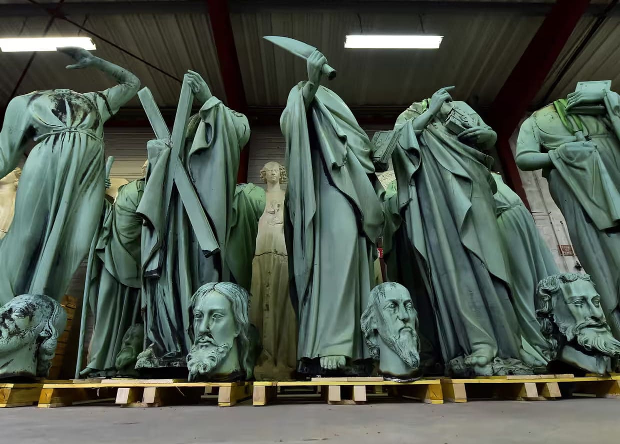 На шпиль Нотр-Дама в ходе последнего этапа реконструкции вернут 16 гигантских статуй апостолов и евангелистов. Скульптуры остались невредимы, так как их сняли за четыре дня до пожара.