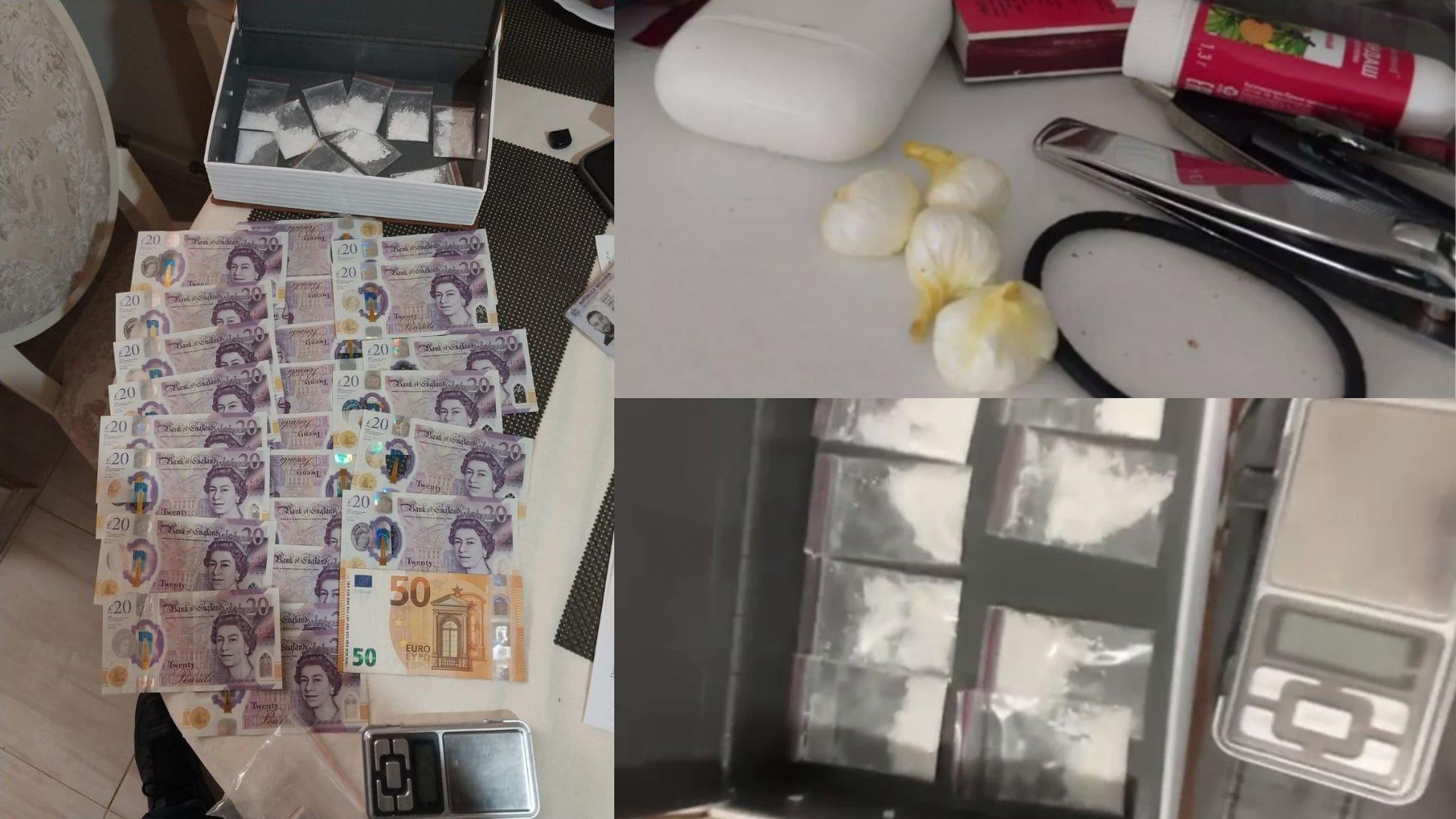 В ходе обысков по месту жительства подозреваемых в Кишинёве были обнаружены пакеты с кокаином, электронные весы, упаковочные материалы, фальшивые евро и доллары, а также документы с признаками подделки. Оценочная стоимость изъятых наркотиков составляет около 200 тысяч леев.