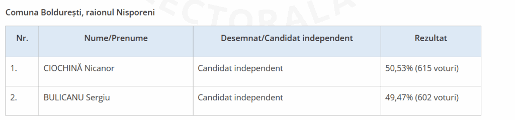 Независимый кандидат Никанор Чокинэ, обвиняемый в том, что насмерть сбил 14-летнего подростка, выиграл второй тур досрочных местных выборов в коммуне Болдурешты, Ниспоренского района. Согласно предварительным результатам, опубликованным в воскресенье, 1 июня, Центральной избирательной комиссией, Чокинэ получил 50,53% голосов (615 голосов), обогнав с небольшим перевесом своего соперника Серджиу Буликану, набравшего 49,47% (602 голоса).