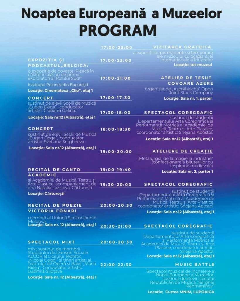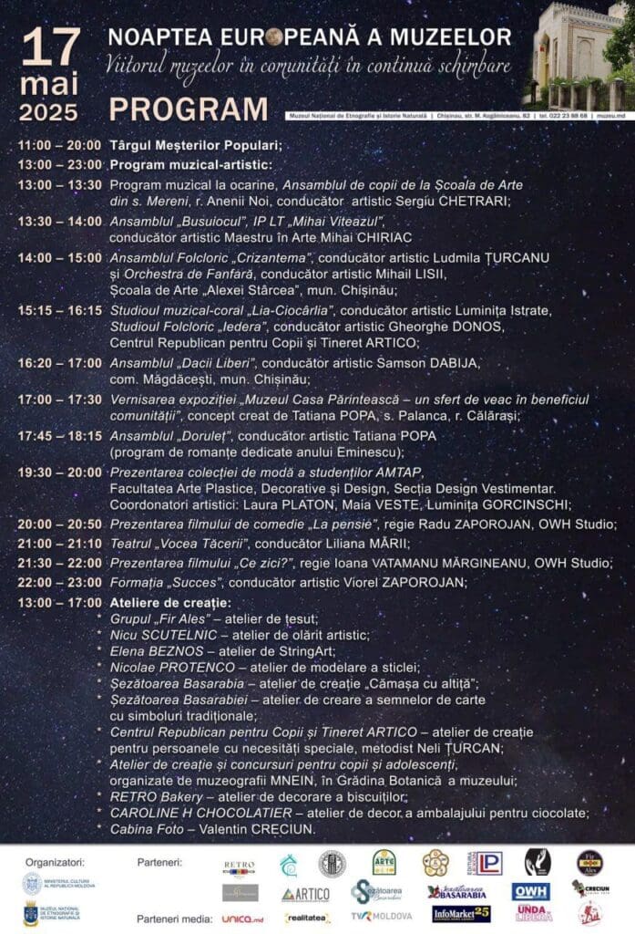 Программа мероприятия включает музыкальные концерты, в том числе с фольклорными элементами, показ мод студентов Академии музыки, театра и изобразительных искусств (AMTAP), творческие мастер-классы по вышивке, лепке из глины, художественному оформлению стекла, а также украшению выпечки и кондитерских изделий. В завершение вечера состоится показ комедийного фильма «La pensie» и киноленты «Ce zici».