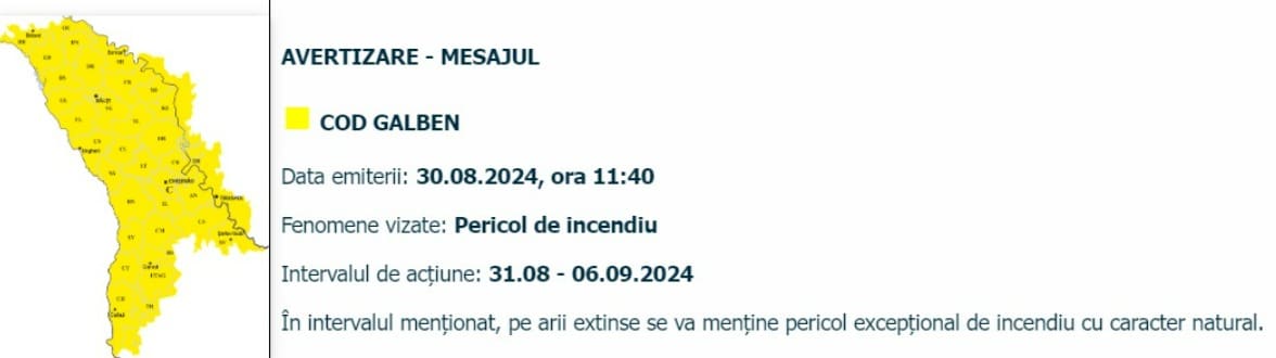 Синоптики выпустили «желтый код» метеоопасности, который будет действовать на территории всей страны. По данным Государственной гидрометеослужбы, в период с 31 августа по 6 сентября существует опасность пожаров.