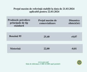 Национальное агентство по регулированию в энергетике (НАРЭ) обновило максимальные цены на основные виды горючего. Предельная стоимость бензина Аи-95 составит 25,40 лея, а дизельного топлива – 22,00 леев.