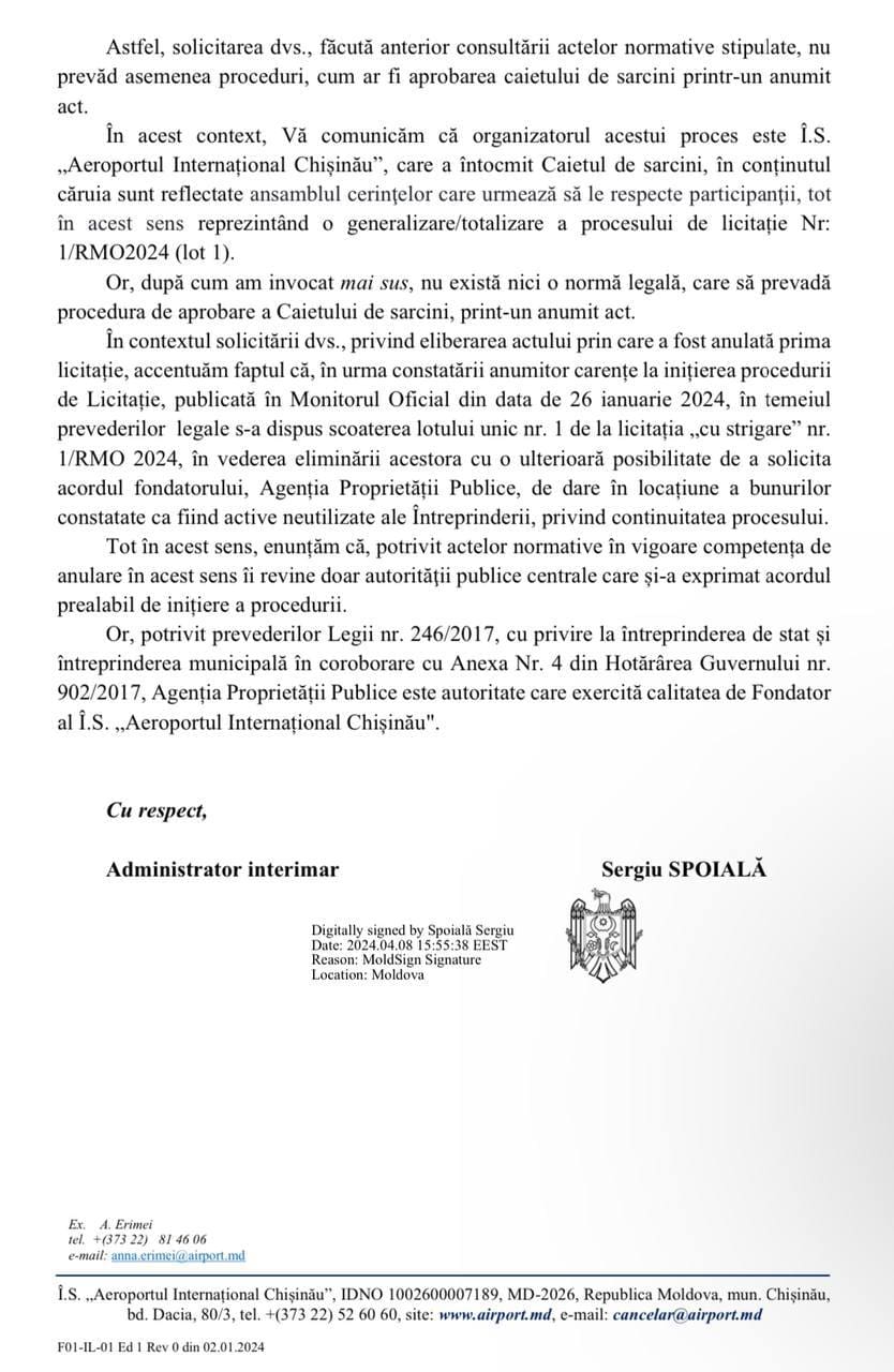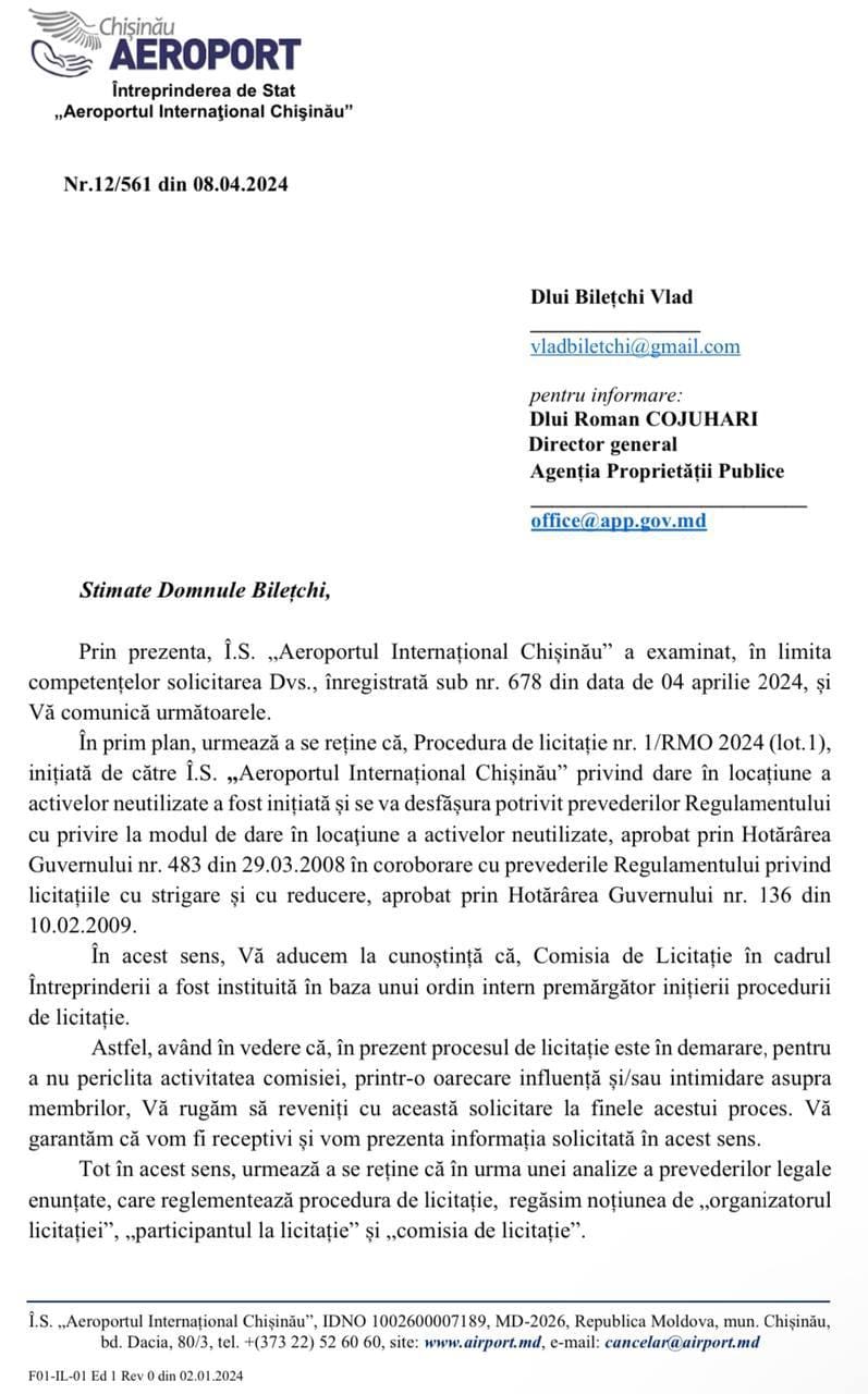 По его словам, 4 апреля он направил письмо в Кишиневский международный аэропорт с просьбой предоставить информацию о комиссии, проводящей тендер, и авторах технического задания. В ответе, полученном от нового и. о. администратора предприятия Серджиу Споялэ, активиста призвали подождать до завершения конкурса, чтобы не отпугнуть членов тендерной комиссии и не оказать на них влияние. Споялэ также признал, что за разработку технического задания отвечает не кто-то конкретно, а Кишиневский международный аэропорт. На вопрос о том, кто принял решение об отмене тендера, конкретного ответа тоже не последовало.