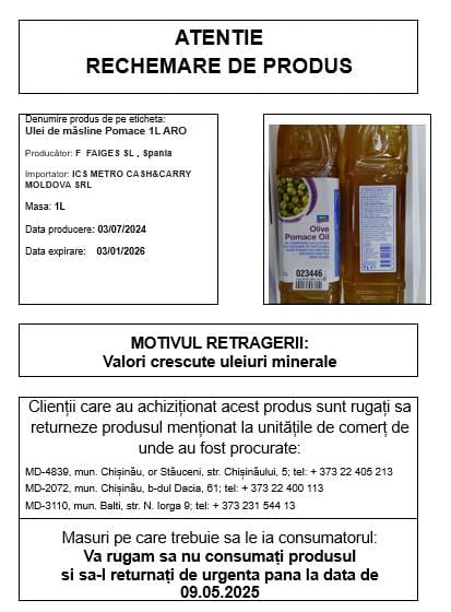 Национальное агентство по безопасности пищевых продуктов (НАБПП) сообщает потребителям, что импортер Metro Cash & Carry Moldova отзывает партию оливкового масла из-за превышенного уровня минеральных масел. Потребителей просят не употреблять продукт и вернуть его в магазин до 9 мая.