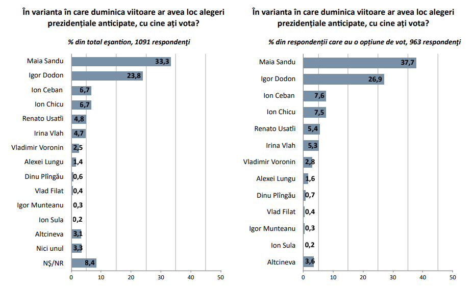 Большинство респондентов заявили, что проголосуют за кандидатуру Майи Санду — более 33 процентов, тогда как бывший президент Игорь Додон не наберет более 24 процентов.
