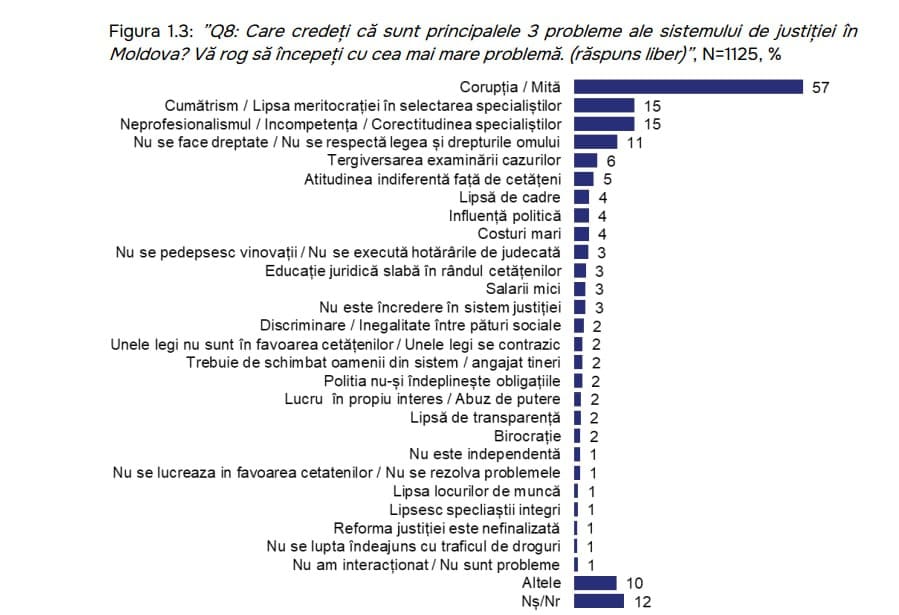 На вопрос, каковы три основные проблемы системы правосудия, 57% респондентов назвали коррупцию и взяточничество. Далее следуют кумовство, отсутствие меритократии и непрофессионализм специалистов (по 15%).