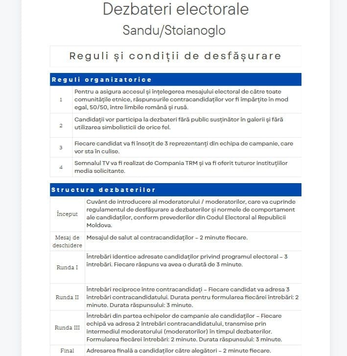 Среди правил, предложенных командой Стояногло — 50% ответов должны быть на русском языке, дебаты пройдут без зрителей и без использования какой-либо символики, каждого кандидата будут сопровождать три представителя из его предвыборной команды, которые будут находиться за кулисами.