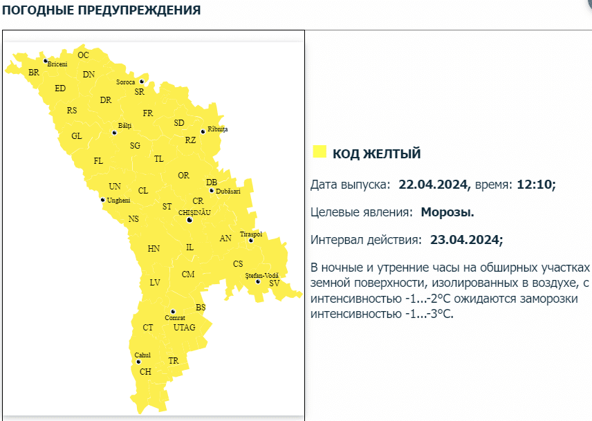 Государственная метеорологическая служба объявила «желтый код» в связи с похолоданием. Предупреждение действует в ночные и утренние часы на всей территории Молдовы.