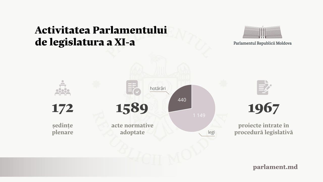За четыре года работы Парламент XI созыва принял 1589 нормативных актов, включая 1149 законов и 440 постановлений. Депутаты проголосовали за 217 рамочных законов и два конституционных закона, ратифицировали 259 международных соглашений и денонсировали 26 договоров. Среди постановлений 173 касались назначений, увольнений и отставок. Пресс-служба законодательного органа подвела итоги четырехлетней работы народных избранников.