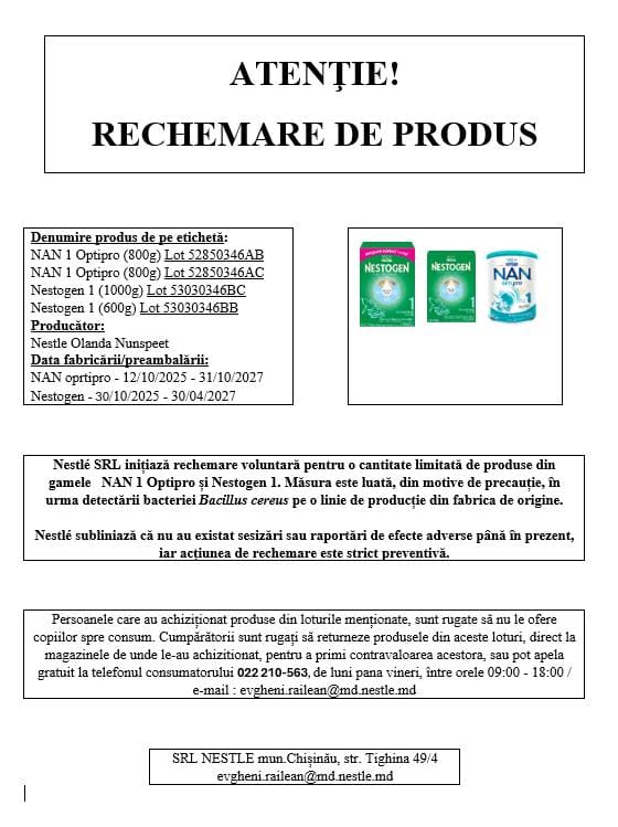 Национальное агентство по безопасности пищевых продуктов (НАБПП) распространило срочное предупреждение для потребителей. Ведомство сообщило о начале процедуры добровольного отзыва с рынка Республики Молдова нескольких партий детских молочных смесей. Мера была принята после обнаружения бактерии Bacillus cereus на производственной линии завода-изготовителя в Нидерландах.