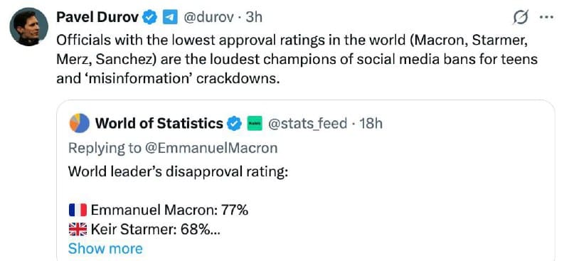 По мнению миллиардера, политики с рекордно низкими рейтингами одобрения — президент Франции Эммануэль Макрон, премьер Британии Кир Стармер, канцлер Германии Фридрих Мерц и премьер Испании Педро Санчес — используют лозунги о защите детей как инструмент для борьбы с дезинформацией и установления цензуры. Дуров подчеркнул, что подобные инициативы угрожают анонимности всех пользователей, так как требуют внедрения систем тотальной проверки личности и массового сбора данных.