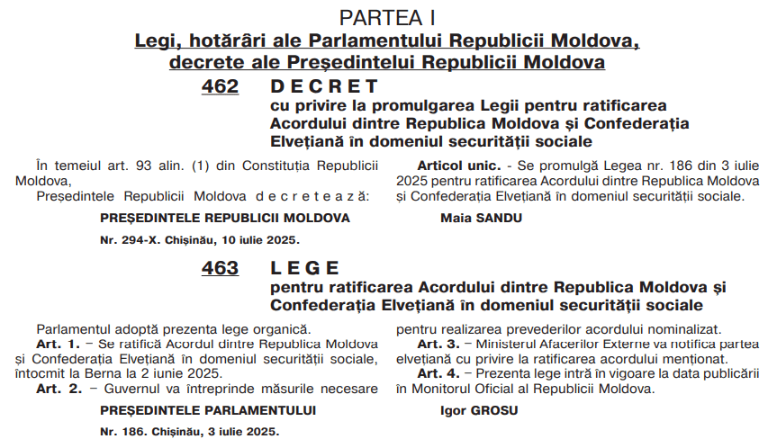 Граждане Молдовы, проживающие в Швейцарии, смогут получать пенсии и другие социальные гарантии на основании международного соглашения в области социального обеспечения, подписанного 2 июня 2025 года в Берне. Указ о промульгации и закон о ратификации соглашения были опубликованы в «Официальном вестнике Республики Молдова».