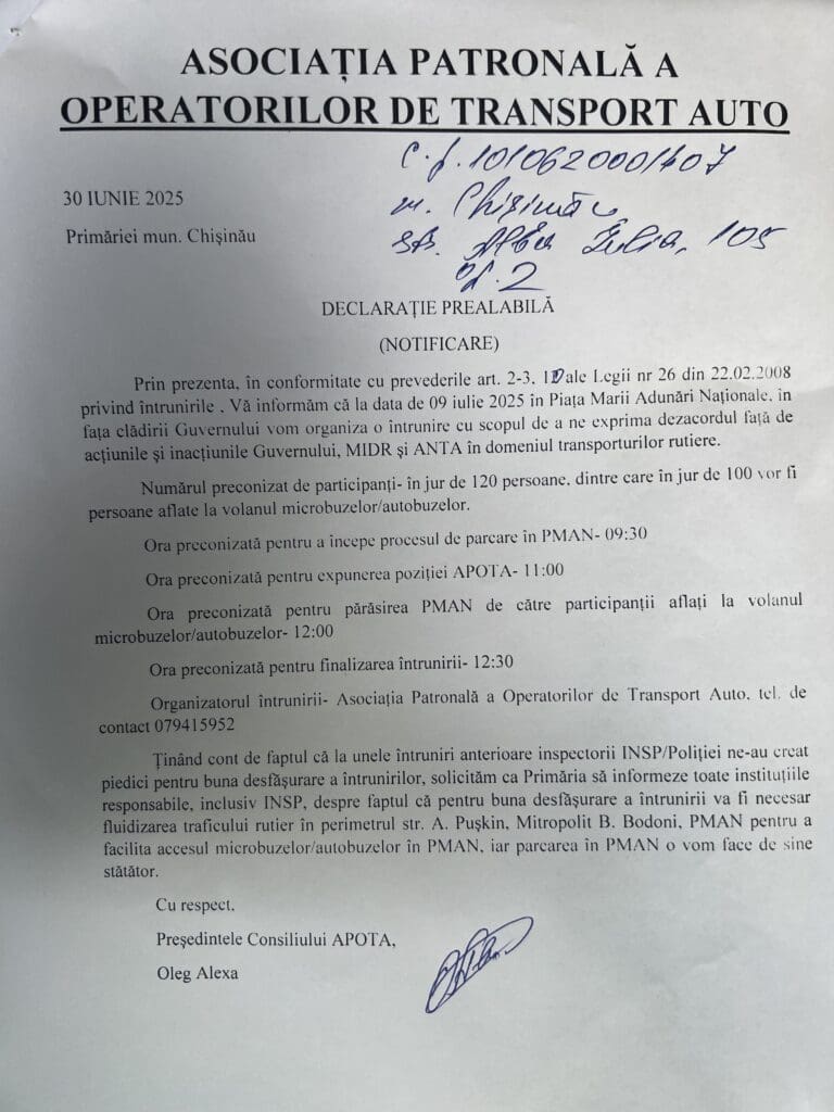 Ассоциация патронатов в области дорожного транспорта (APOTA) сообщила, что в среду, 9 июля 2025 года, состоится акция протеста перевозчиков. Согласно предварительному заявлению, переданному мэрии Кишинева, на мероприятии ожидается около 120 участников, из которых примерно 100 будут за рулём микроавтобусов и автобусов.