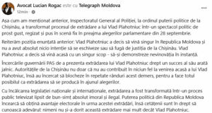 Адвокат Влада Плахотнюка, Лучиан Рогак, сделал заявление, но не перед СМИ, а в социальных сетях. Он заявил, что процесс экстрадиции бывшего лидера демократов из Греции в Республику Молдова был намеренно организован властями накануне парламентских выборов.