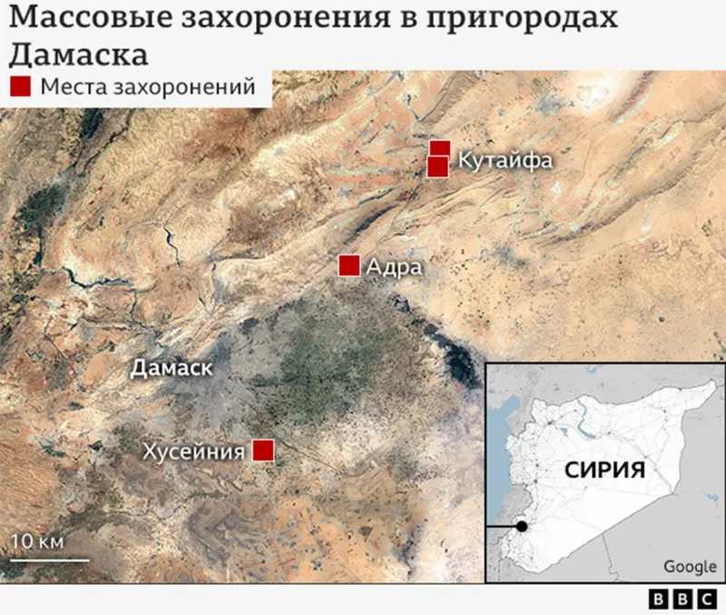 Жители Сирии, живущие рядом с захоронениями в Кутайфе и Наджхе, заявили Reuters, что видели, как туда на грузовиках постоянно доставляли тела, которые сбрасывали в длинные траншеи, вырытые бульдозерами.