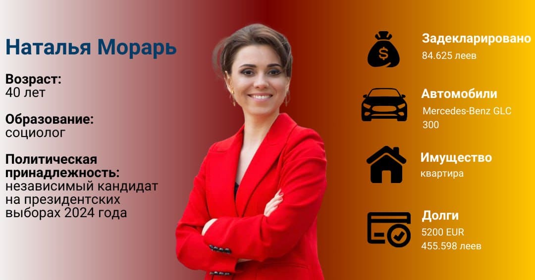 Согласно декларации об имуществе и личных интересах, в 2023 году Морарь получила доход в размере более 84 000 леев от компании «Media Sapiens SRL» и 36 000 евро в качестве пожертвования на содержание своего несовершеннолетнего ребенка. Кроме того, бывшая журналистка указала доход в размере более 21 000 леев от пяти SRL. Кандидат также владеет недвижимостью площадью 176,8 кв. м, приобретенной в 2021 году. Стоимость недвижимости она не указала. Согласно декларации о доходах, в 2024 году Наталья Морарь купила роскошный автомобиль, произведенный в 2023 году. Это Mercedes-Benz GLC-300 D 4MATIC. Она не указала цену автомобиля, но, по данным специализированных сайтов, он будет стоить около 60 000 евро.