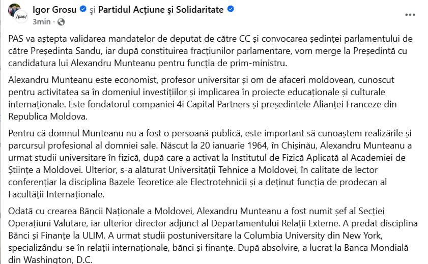 После подтверждения мандатов депутатов и формирования парламентских фракций PAS планирует представить президенту Майе Санду кандидатуру Александру Мунтяну на пост премьер-министра. Об этом сообщил спикер Игорь Гросу на своей странице Facebook.