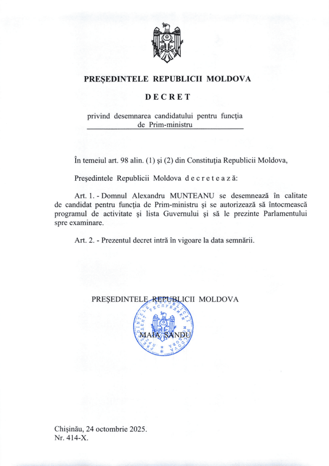Президент Республики Молдова Майя Санду подписала указ о выдвижении Александру Мунтяну кандидатом на должность премьер-министра страны. Глава государства сообщила, что решение было принято по итогам консультаций с парламентскими фракциями.