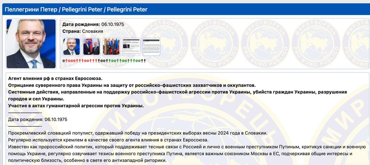 Президент Словакии Петер Пеллегрини был внесён в базу украинского сайта «Миротворец» за действия, направленные на поддержку России. На сайте Пеллегрини назвали «агентом влияния РФ в странах Евросоюза», который активно критикует антироссийские санкции и выступает против военной помощи Украине.