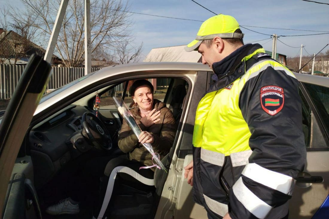 Утром 8 марта в Приднестровье сотрудники так называемого ГАИ устроили необычную акцию, посвящённую Международному женскому дню. Инспекторы дорожной полиции останавливались на улицах, чтобы поздравить женщин-водителей, даря им цветы и желая лёгкой дороги.