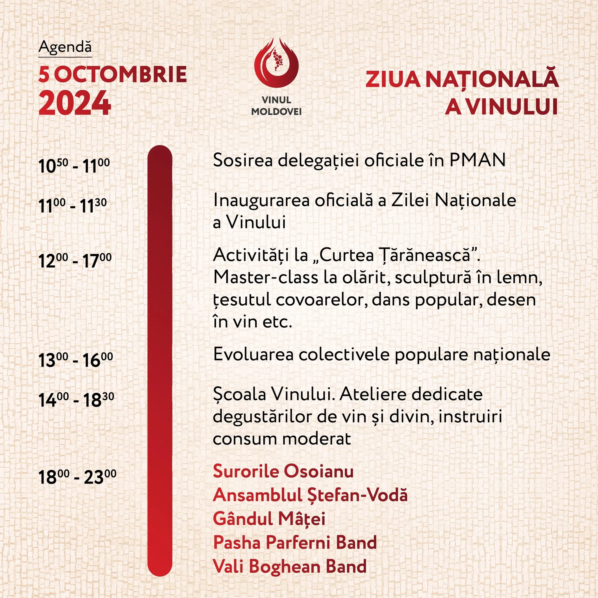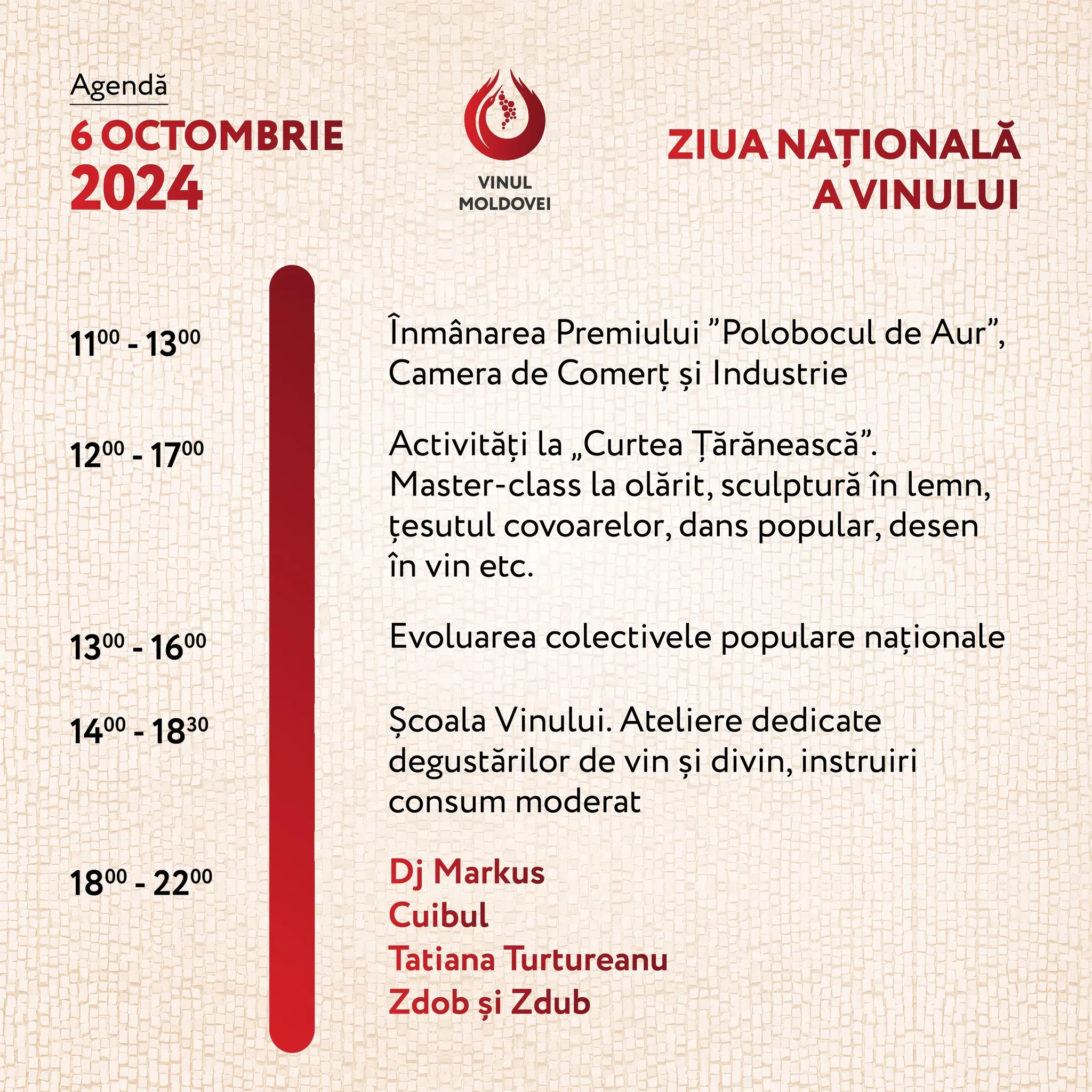 Праздничные мероприятия стартуют сегодня, в 11:00 состоится официальная церемония открытия. Посетителей ожидают мастер-классы по народным ремеслам, выступления национальных фольклорных коллективов, дегустации вин и дивинов, а также концерт. В шесть вечера на сцену выйдут сестры Осояну, ансамбль «Штефан Водэ», Gîndul Mîței, Паша Парфени и Вали Богян.