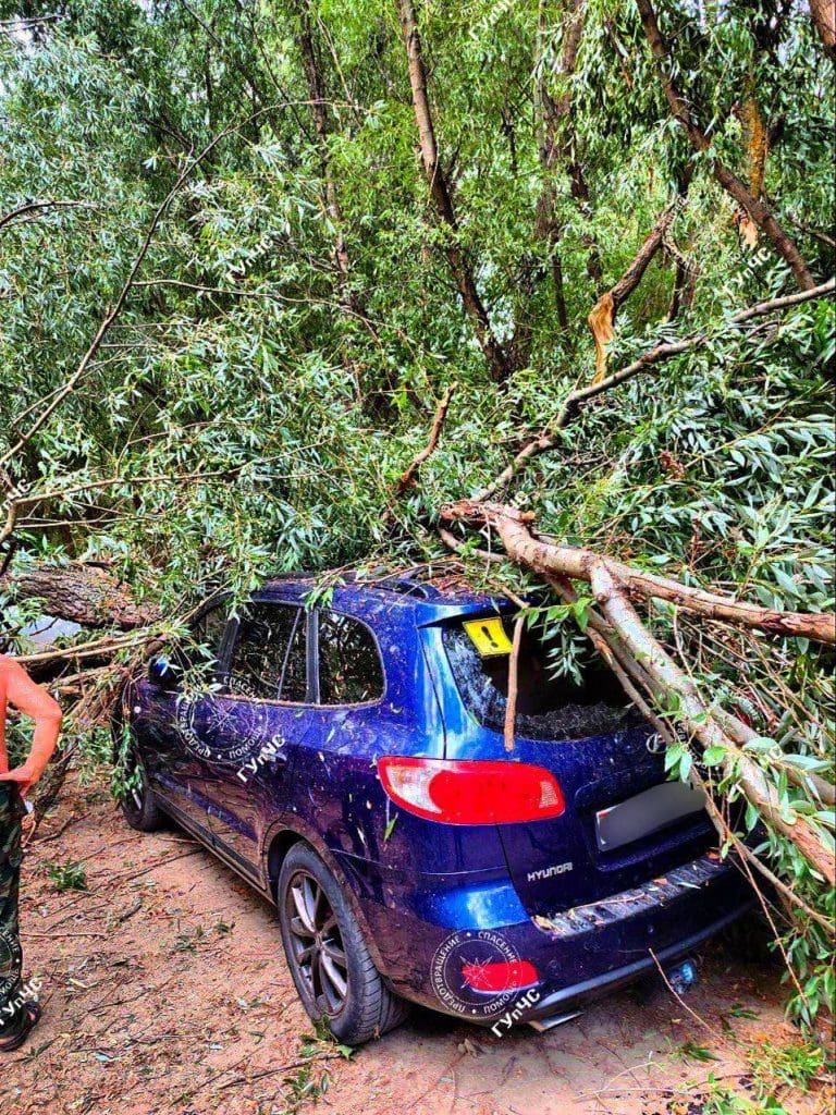 Ветка упала на автомобиль, оставив вмятины. Спасатели оперативно устранили последствия непогоды.