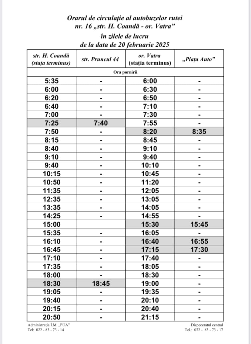 «С 20.02.2025 г. вносятся изменения в расписание движения пригородного автобусного маршрута № 16 «ул. Х. Коанда – город Ватра» по будням. Для получения дополнительной информации вы можете позвонить в диспетчерский центр PUA по номеру телефона 022 837 317 / 022 558 071″, — сообщает учреждение.