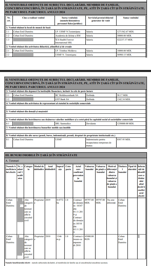 В 2024 году доходы супруги Эмиля Чебана составили следующие суммы: из USMF – 56 980,15 леев, кроме того, ей были начислены дивиденды от компании SRL „Sanmedico“ в размере 1 250 000,00 леев, а также доходы от „Health Forever“ SRL в сумме 522 237,37 леев. Сложив эти суммы, получаем общий доход супруги за год – 1 829 217 леев.