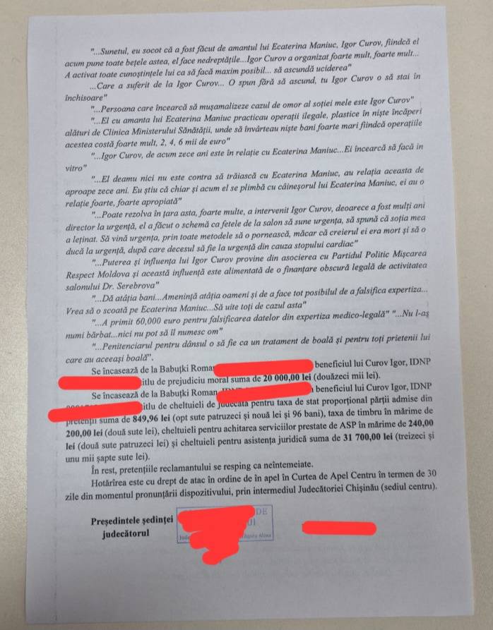 Напомним, суд обязал Романа Бабуцки выплатить 20 тысяч леев в качестве компенсации морального ущерба Игорю Курову, который в 2024 году был отстранен от должности директора Клинической больницы минздрава после скандала, связанного с деятельностью подпольной клиники красоты на территории учреждения. Куров обратился в суд после того, как его публично обвинили «замалчивании дела».
