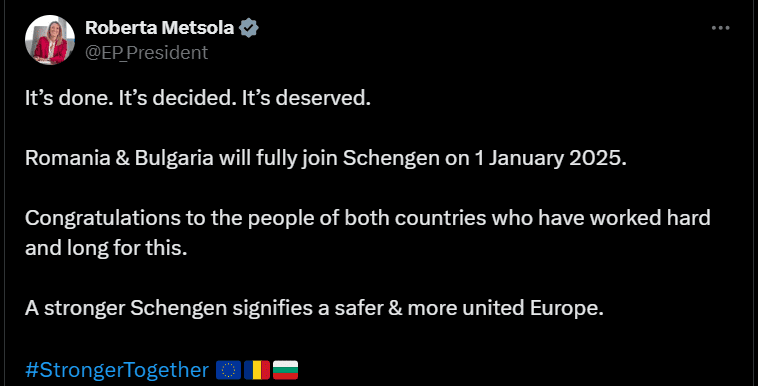 Румыния и Болгария войдут в Шенгенское пространство с 1 января 2025 года, объявила председатель Европейского парламента Роберта Метсола в четверг, 12 декабря, в социальной сети X.